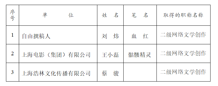 2020年度上海市文学创作系列网络文学专业高级技术职称评审通过人员名单公示