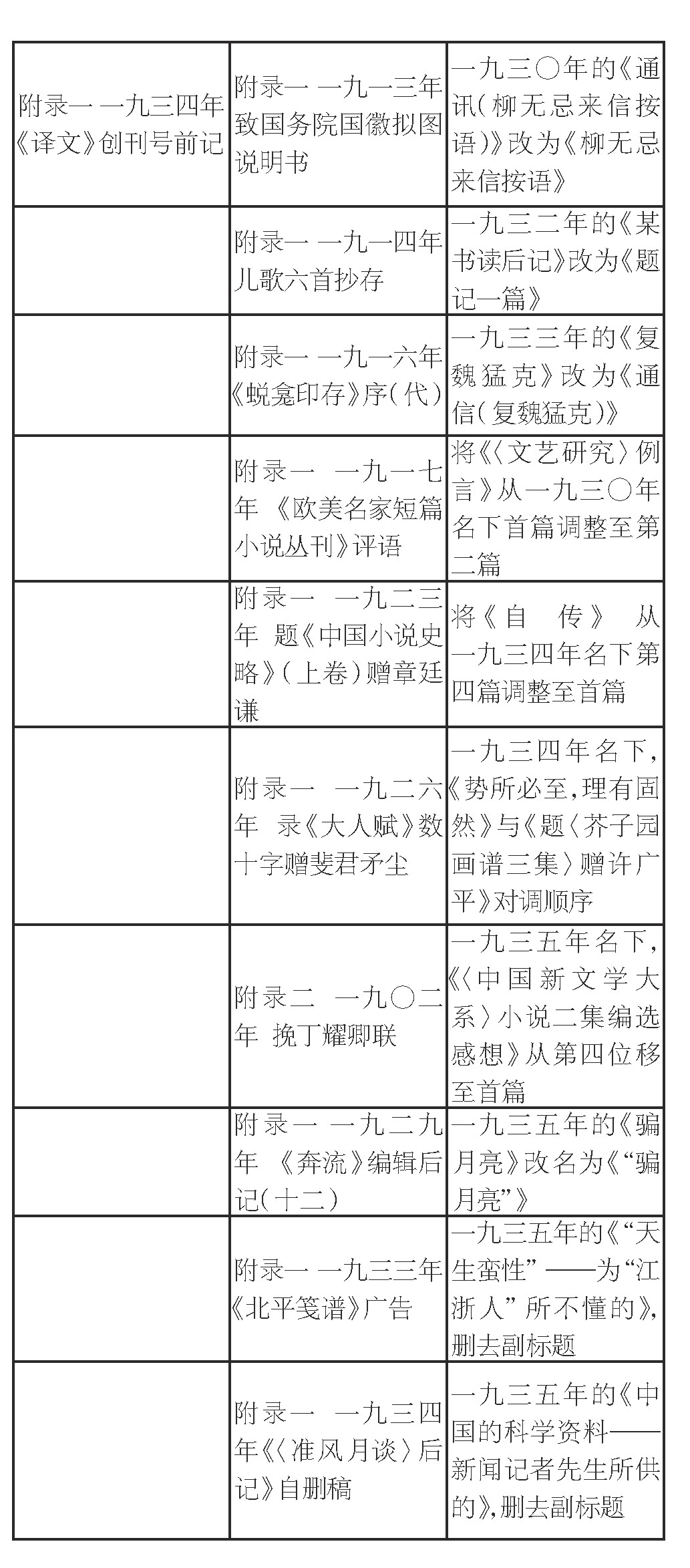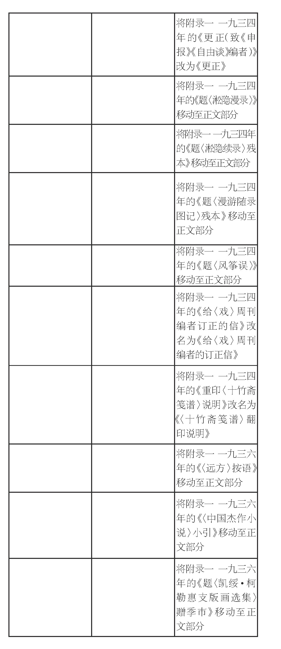 调整篇目位置14篇(其中3篇同时改名),指将文章在正文与附录一之间对调,数量虽少,却颇具讨论空间。其中从正文转为附录一的4篇,从附录一转为正文的10篇。结合篇名与文章内容,大致可以判断对调的原因。由正文转为附录一的多是应用文体,包括宣言、编目、广告、启事等。附录转为正文则更强调文学性,需要“相对成文”。10篇中有7篇都是题记,尽管短小,却很隽永,自成一体。如《题〈陶元庆的出品〉》睹物思人,寄托哀思怀念,感情真挚强烈。《题〈淞隐漫录〉》等四篇介绍古籍版本源流、考订异同,已形同书话。其他三篇,《闻小林同志之死》近似于悼念词和声明的复合体。《〈远方〉按语》《〈中国杰作小说〉小引》两篇则实际是序跋。