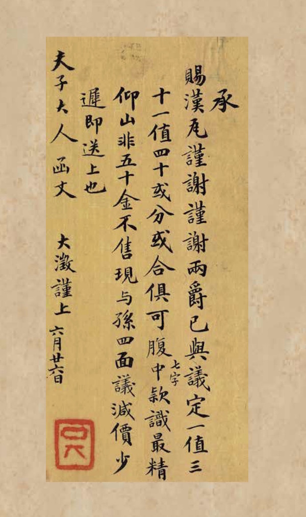 承赐汉瓦,谨谢谨谢。两爵已与议定,一值三十,一值四十,或分或合俱可。腹中七字款识最精。 仰山非五十金不售,现与孙四面议减价,少迟即送上也。 夫子大人函丈。大澂谨上。六月廿六日