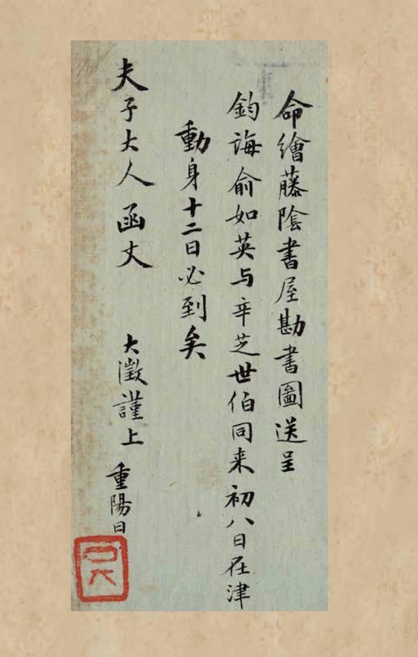 命绘《藤阴书屋勘书图》送呈钧诲。俞如英与辛芝世伯同来,初八日在津动身,十二日必到矣。 夫子大人函丈。大澂谨上。重阳日。