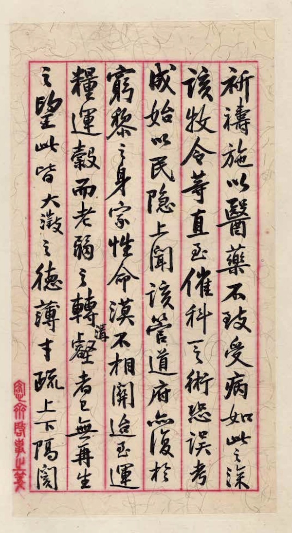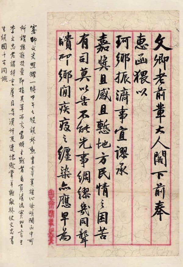 文卿老前辈大人阁下:前奉 惠函,猥以珂乡振济事宜,谬承 嘉奖,且感且惭。地方民情之困苦, 有司莫以告,不能先事绸缪,几同聋瞆耶。乡间疾疫之缠染,亦应早为