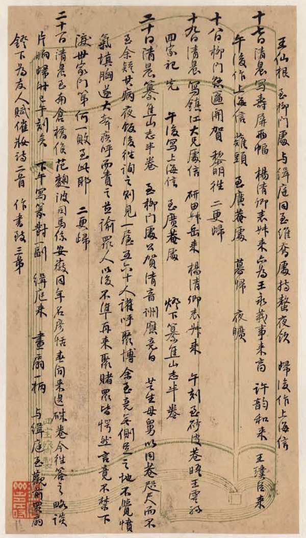 二十日 清晨纂《焦山志》半卷。至柳门处公贺清音,詶应竟日。芝生母舅以同巷咫尺而不至,余疑其病,夜饭后往询之。则见一屋五六十人,欢呼聚博,余至竟无侧足之地,不觉愤气填胸,遂大声疾呼而责之,并谕众人以后不准再来聚赌,众皆愕然,言竟不禁下泪。世家门第,何一败至此耶?二更归。