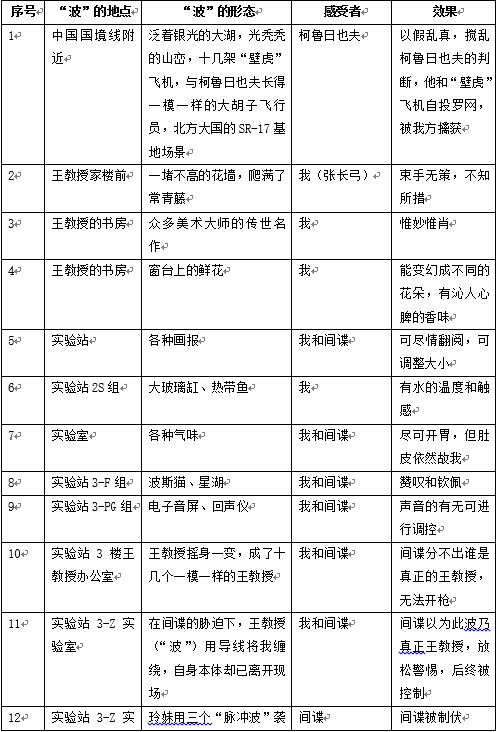 如上表所示,“波”贯穿于小说的始终,是故事情节发生、发展到高潮的主要推手和真正主角。这是何等超前和瑰丽的科幻想象:枫市王教授设计出来的用于军事防御的波-45系统,以波的原理营造出变化万端的虚拟场景,使北方大国的壁虎式飞机自投罗网;“我”去王教授家,被其住宅外的花墙波、住宅内的中外名作画像波、窗台上不断变换着的鲜花波深深吸引,叹为观止;面对敌人的控制,王教授利用波形成迷幻陷阱,巧擒企图窃取波理论专利的亡命之徒……在小说中出现的几场“猫捉老鼠”的游戏中,起先貌似是入侵者(不管是驾驶壁虎式飞机的柯鲁日也夫,还是假冒“洪青”窃取波理论的亡命之徒)掌握主动权,但随着故事的逐渐推移,他们纷纷败在了“波”的面前。这是人类科技智慧的较量与比拼,“波”的千变万化,与各种所需场景进行视觉、听觉、味觉、嗅觉等方面的无缝融合与对接。