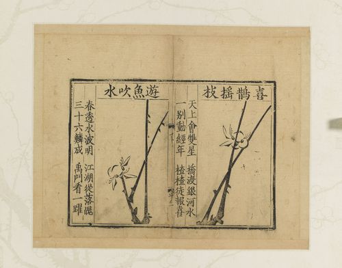 另一幅台北故宫博物院藏的选自《集古图绘册》的扬无咎梅花,于画幅中央水墨画梅干一枝,虽幅中题跋几布满画面,但并无损于画家以简洁的笔意,展现梅的隽拔幽雅和文人雅趣,也适度地表达了画家孤芳自赏的个性。