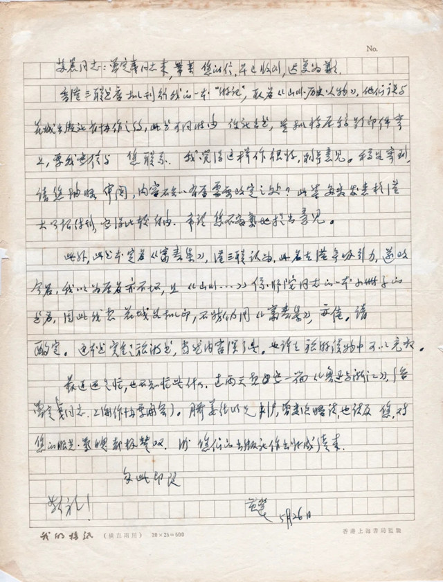 五通信札均为钢笔书写,文字内容著录于2019年齐鲁书社出版的《榆下夕拾》中,但个别字句有释读错误。第一通信札书写在20×25=500的十六开稿笺纸上,横写,稿纸下侧印有“我的稿纸(横直两用),香港上海书局监制”字样。信札书文曰: