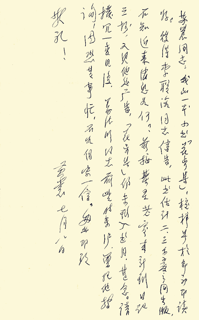 最近还是忙,也不知忙些什么,过两天想写一篇《鲁迅与浙江》,给曾定夷同志,上海作协要开会了。月前姜德明兄来沪,曾数次晤谈,也谈及您,对您的眼光、气魄都极赞叹。盼你们的出版社做出好成绩来。匆此即致敬礼!