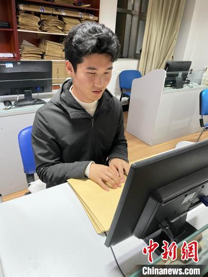 牛鑫志在手读盲文资料。滨州医学院供图