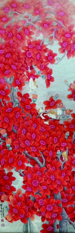 艺术贵创新,而翻新出奇是需要独出心裁的,对于艺术家而言,这就是挑战。陈奕纯的新作《花开有声》,也是以木棉花为创作题材的,但其所要表达的,却远不止于习常的对木棉花的礼赞,更达到一种深邃而宏远的境界。与同类作品相比,艺术视野更加开阔,既是对春天的歌颂,更流露出对伟大祖国的热爱之情。