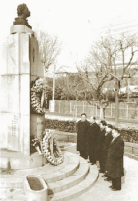 1956年,巴金(右一)等在上海向普希金纪念碑献花。