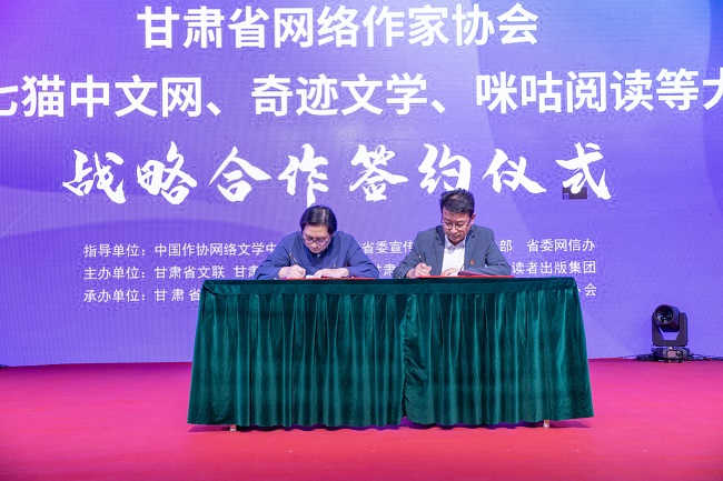 甘肃省网络作协秘书长王熠和奇迹文学总编辑郭晨辰签订战略合作协议