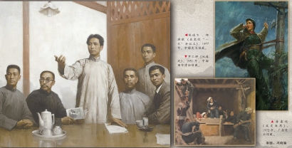 陈逸飞 、邱瑞敏 《在党的 “一大”会议上》,1977年,中国美术馆藏。 罗工柳《地道战》,1951年,中国国家博物馆藏。 潘嘉俊《我是海燕》,1972年,广东美术馆藏。 制图:冯晓瑜