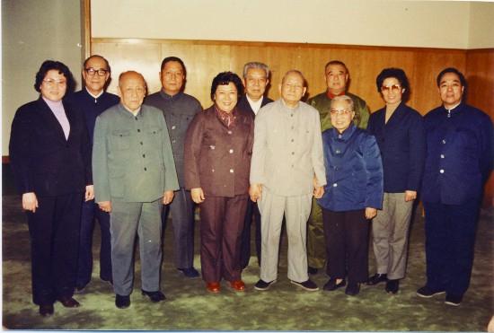 1984年中央领导人陈云(右五)邀请曲艺界知名人士在中南海共度春节(右起:袁阔成、赵玉明、骆玉笙、高元均、陈云、邓力群、马增慧、罗杨、陶钝、侯宝林、刘兰芳) 新华社记者:李平摄