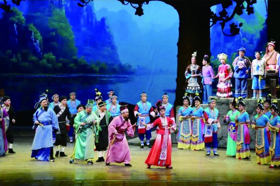 四、“刘三姐”是中国戏曲体系持续延展并凝结而成的国家形象、民族声音。“刘三姐”是中国乃至世界共享的文化名片,从彩调剧到电影,再到多个艺术样式,刘三姐的形象与题材已经在时代变迁中具有了超越现实的符号象征意味,已经成了用优美的歌唱和善良人性来传达生活理想的载体。在经典的《刘三姐》舞台艺术高峰之上,广西壮族自治区戏剧院通过《新刘三姐》的创作,凸显“刘三姐”文化对于当代生活和新时代理想的涵摄与延展。今天舞台上的“新”,当然是保持戏曲本体而进行的时代生活再现,那种岭南农村、民族族群的现实状态最容易像今天众多的现实题材创作那样,流于一般性的政策图解,但是《新刘三姐》却尽量避开这种创作误区,依然用歌唱的美、山歌的美、人性的美,来审视八桂大地这块文化空间中人们的去留与生活。山水依然,而游子回归,剧作中主人公最终走向的是中国人文的情感故园与精神驻地。这是该剧迥异于当前现实题材创作的所在。《新刘三姐》将当代社会生活中的诸多重大现象,例如新农村建设、城市创业等等,全部融汇成现代青年男女对于真实感情的表达,用情感的推移来呈现生活的变奏、精神的蜕变和生命的升华,这也印证了乡土戏曲“以一国之事系一人之本”的文化根本要义。因此,这部作品推崇情感表达,张扬人性美好,肯定草根立场,表达诗性人生,崇尚民族共同意识,彰显国家现代立场,形成与众不同的戏曲舞台面貌,以优雅的艺术化、轻松的娱乐化来建构现代舞台,成为追步《刘三姐》艺术宗旨的又一部跟进之作,也是“刘三姐”文化实现现代转化的又一个精彩个案。该剧当然更应该用《刘三姐》60年的创作经验和传承规律,不断打磨,让人能够看到企及经典的发展空间。