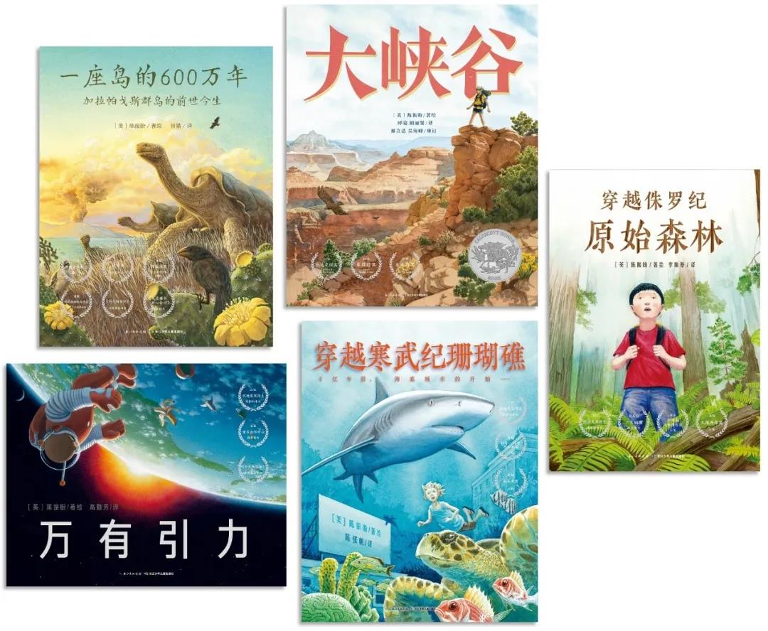 目前,国内已引进出版了陈振盼独立著绘的五部科普作品①,(见组图1)每部均获奖颇丰。其中,《大峡谷》(Grand Canyon)获得2018年凯迪克银奖、赛博特奖、奥比斯奖;《一座岛的600万年:加拉帕戈斯群岛的前世今生》(Island:A Story of the Galápagos)获得2013年狮鹫奖,并被美国《学校图书馆杂志》(School Library Journal)、《科克斯书评》(Kirkus Reviews)共同评为2012年度最佳图书;《穿越寒武纪珊瑚礁》(Coral Reefs:A Journey Through an Aquatic World Full of Wonder)入围美国矢车菊奖;《穿越侏罗纪原始森林》(Redwoods)获得亚马逊十大编辑精选童书。《万有引力》(Gravity)也非常出色,获得美国童书中心推荐和《科克斯书评》年度最佳图书。可以说,陈振盼是当之无愧的童书界“宝藏男孩”,据说其创作初衷是“让纽约的孩子也能看到原始森林”。他做到了,如今,城市里的孩子能通过陈振盼的作品看见世界上真实存在的奇迹,看见恢宏的想象力交织而成的绝妙作品。