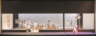 在舞台中央缓缓打开的三面巨大“白墙”前,红色边框,把贾宝玉、林黛玉、薛宝钗、王熙凤等人物一个个框进来,白与红,也延伸到他们的服饰,昭示了基调和变奏的主题。