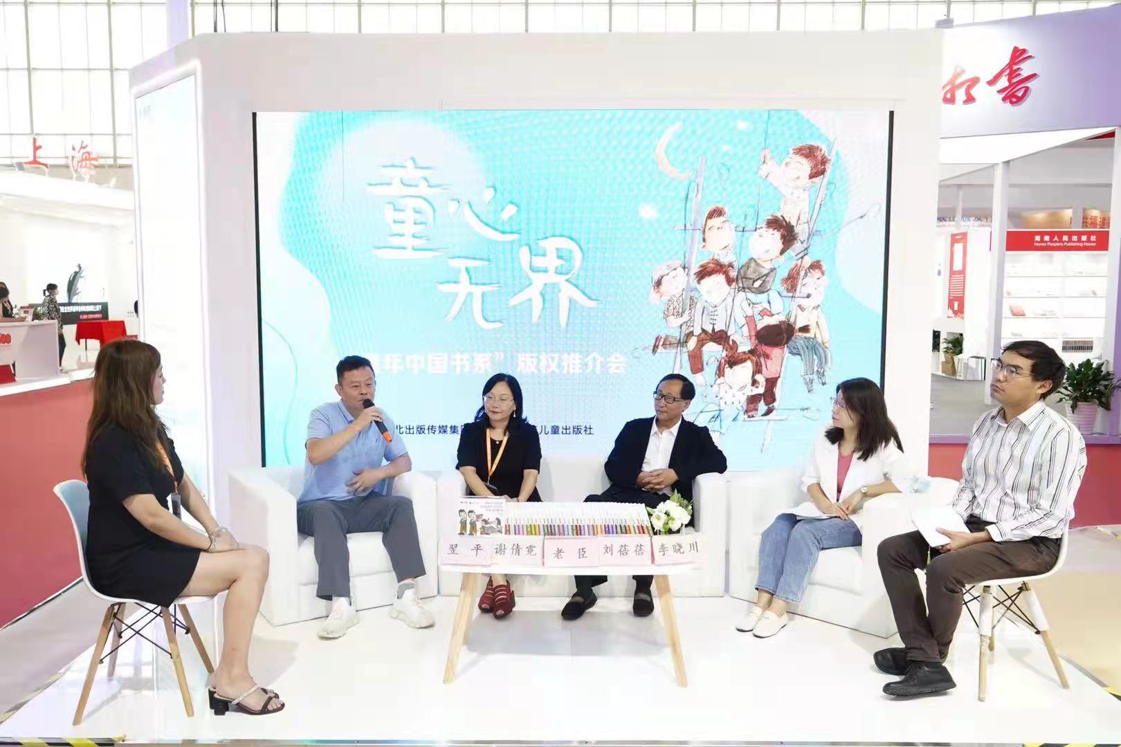 2021年9月16日,童心无界——“童年中国书系”版权推介会在中国国际展览中心河北出版传媒集团展位举行。冰心奖评委会秘书长、儿童文学作家、“童年中国书系”主编翌平,儿童文学作家老臣,儿童文学作家、《少年文艺》执行主编谢倩霓、《中国新闻出版广电报》周刊中心副主任刘蓓蓓、北京尚斯国际文化交流有限责任公司版权部主任李晓川出席了版权推介会。