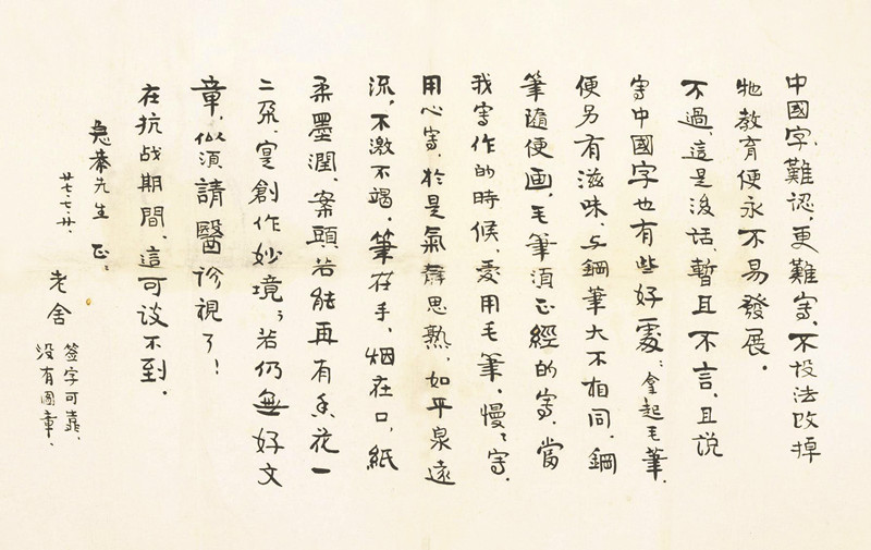 释文:中国字难认,更难写,不设法改掉它,教育便永不易发展。不过这是后话,暂且不言。且说写中国字也有些好处,拿起毛笔便另有滋味,与钢笔大不相同,钢笔随便画,毛笔须正经的写。当我写作的时候,爱用毛笔慢慢写,用心写,于是气静思熟,如平泉远流,不激不竭,笔在手,烟在口,纸柔墨润,案头若能再有鱼花一二朵,实创作妙境,若仍无好文章,似须请医诊视了!在抗战期间,这可谈不到。