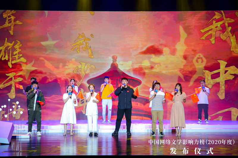 9月16日晚,中国网络文学影响力榜(2020年度)发布晚会现场,在深圳龙岗文化中心大剧院的舞台上,十几个年轻人手挥着国旗,有些羞赧地唱着《少年中国说》,逐渐进入状态后,愈发慷慨激昂的歌声令人热血澎湃,仿佛年轻的他们就是这首歌最好的注脚。