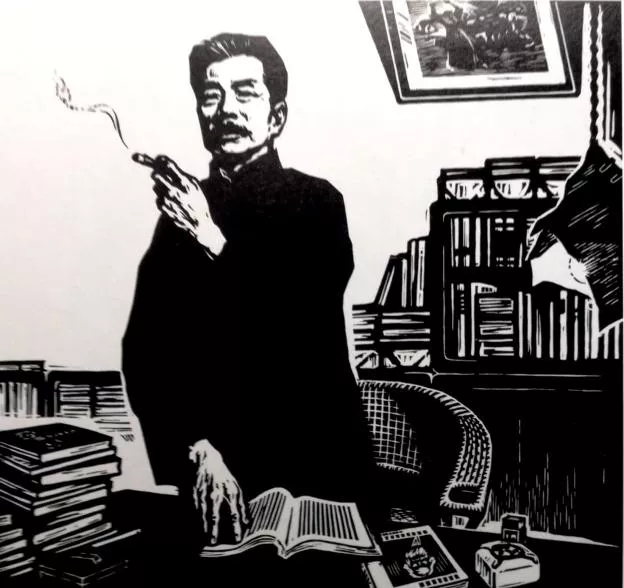 而鲁迅则毋庸置疑地被树立为了自我改造的榜样。1951年鲁迅逝世十五周年纪念日时,《人民日报》发表社论《学习鲁迅,坚持思想斗争!》指出:“当鲁迅先生仅仅是一个进化论者的时候,他的勇敢曾经有时候伴着对于前途的迷惑。但在接受了马克思列宁主义的真理以后,他就成了坚决的彻底的毫不怀疑的思想的战士了。”[10]知识分子的自我改造由此成为鲁迅逝世纪念活动的题中之义。既然鲁迅的自我改造是在马列主义的指导下实现的,那么在美术家的笔下,鲁迅作为自我改造模范的形象一定和马列主义有密切的关联。《认真学习马列著作》(图7)这幅油画描绘的即是鲁迅学习马列著作的情景,画面中鲁迅划燃火柴准备点烟,火柴已经烧完了半截,然而鲁迅的目光却依旧被桌子上摊开的书所吸引,迟迟不能移开。这个瞬间极为生动地表现出鲁迅学习马列著作的认真和投入。进一步地,能让烟不离手的鲁迅“废烟忘点”的马列著作,无疑具有巨大的价值和魅力,对鲁迅产生着深刻的影响。李以泰的木刻《马克思主义是最明快的哲学》(图8)同样表现了这一主题。图画中的鲁迅一手擎烟一手按书,从容而立,凝神静思,神情中满是向往,颇有几分沉醉于马列著作中的微醺之色。很明显,美术家们在图像中表达出来的意蕴是,只有深刻、彻底地认同马列主义,才能够实现思想上的转变,真正成为党的一份子,或是党的同路人。鲁迅就是最典型、权威的榜样。
