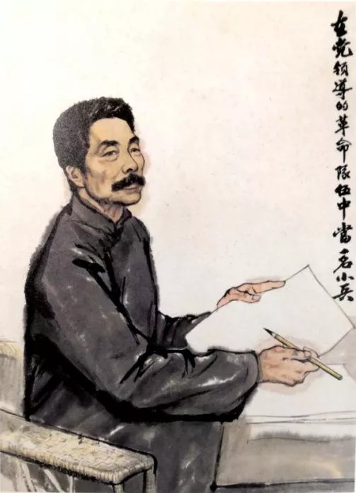 鲁迅“党的小兵”形象的塑造与冯雪峰关系甚大。1952年,冯雪峰如此回忆和鲁迅相处的细节:有一天“在谈到了我党和毛主席以后”,鲁迅“半向着坐在书桌旁边的我,半向着窗子,一手横在胸前托着另一只拿着纸烟的手的手肘,只是那么柔和地默默地微笑着,然后怡然自得地、又好象忘我地、缓慢平静地说:‘我想,我做一个小兵是还胜任的,用笔!’”[11]之后的1959年,许广平写了《鲁迅回忆录》,更为明晰地刻画出了“党的一名小兵”的鲁迅形象:大革命失败后,鲁迅“思想有了突变,从量变到了质变,于是他否定了进化论的偏颇,接受了马列主义的真理,投入了阶级斗争的行列,他自己说愿意在党领导的革命队伍中当一名‘小兵’。”[12]如此带有个人感情色彩且具体细微的“回忆”,当然不仅是回忆。因为冯雪峰和许广平都是鲁迅的身边人,这样的回忆天然地具有真实感,于是,鲁迅的小兵形象也就几乎立竿见影地树立起来了。蒋兆和1956年所作的鲁迅像落款即是:“我想,我做一个小兵是还胜任的,用笔!冯雪峰同志回忆鲁迅先生语,一九五六年兆和。”周思聪也创作过相同主题的作品(图9),画像的题名是“在党领导的革命队伍中当一名小兵”,画中的鲁迅手拿纸笔,坐于桌前,抬头凝望着远处,似在思索如何下笔。他的神态中几乎没有常见的战斗性,并充满了慈和平静以及对远方的向往。画面没有采取通常的仰视视角,而是选择了容易缩小人物、表现人物向往姿态的略显俯视的视角,这就不难理解画家的在构图上的良苦用心了——在党的队伍中,鲁迅就是顺从于党、听命于党的一个小兵。