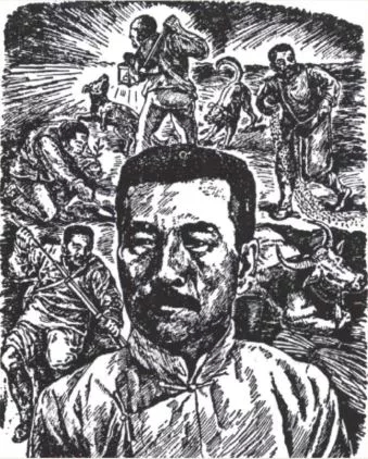 在不同鲁迅图像中具有内在同一性的还有背景设置。背景很多时候和场景是并为一体的,但在非叙事性的鲁迅图像中,背景常被设计为具有特别意义的符号元素。以此,美术家们的创作动机和意图才会更显明地体现出来,鲁迅肖像才可能得到观者的贴切认识和理解。在陈烟桥1948年创作的《鲁迅》(图21)中,神情凝重、悲悯满面的鲁迅背后,是旧中国底层民众生存的惨象。横行的狗、被缚着的人以及军阀的枪,都在无声地控诉着其时的社会时局。鲁迅的反抗性和革命性由此得以凸显。黄新波的《心事浩茫连广宇》(图13)中,背景则更富政治隐喻意味。在鲁迅手中作为“武器”的笔,似已幻化为了真正的枪,牵引着胜利的旗帜;左上角大放光芒的五角星则明示,鲁迅是在马克思主义引领下的无产阶级的一员。有了武器和马克思主义的加持,已是权威的鲁迅更是战无不胜。