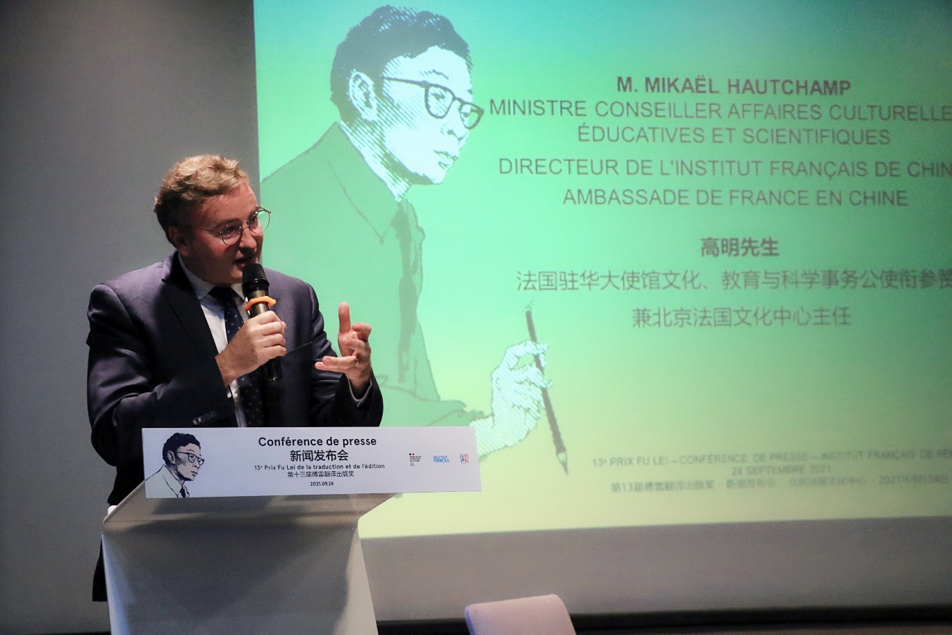 9月24日,第13届傅雷翻译出版奖在北京法国文化中心举行新闻发布会,揭晓本届入围作品,5部社科类作品和5部文学类作品入围。法国驻华大使馆文化、教育与科学事务公使衔参赞、北京法国文化中心主任高明,傅雷翻译出版奖组委会主席、北京大学法语系教授董强,2021年傅雷奖评委会主席吴佳霖(Guillaume Olive),傅雷翻译出版奖常任评委余中先、蒲皓琳(Caroline Puel),2021年傅雷奖特邀评委、2020年傅雷奖获得者汪炜等出席新闻发布会。