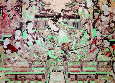 走进复制的莫高窟第220窟,一定要仔细看看北壁的乐舞图。它绘制于初唐,是唐代壁画中最具代表性的,描绘了佛国世界伎乐天奏乐歌舞的场景。画面正中有一座灯楼,两侧各立一树灯轮;左右两厢置乐队,共28人,分为两组,演奏来自中原和西域的各种打击、吹奏、弹拨乐器;两对舞伎在小圆毯上旋转腾踏,巾帛飞扬,跳着唐代盛行的胡旋舞。