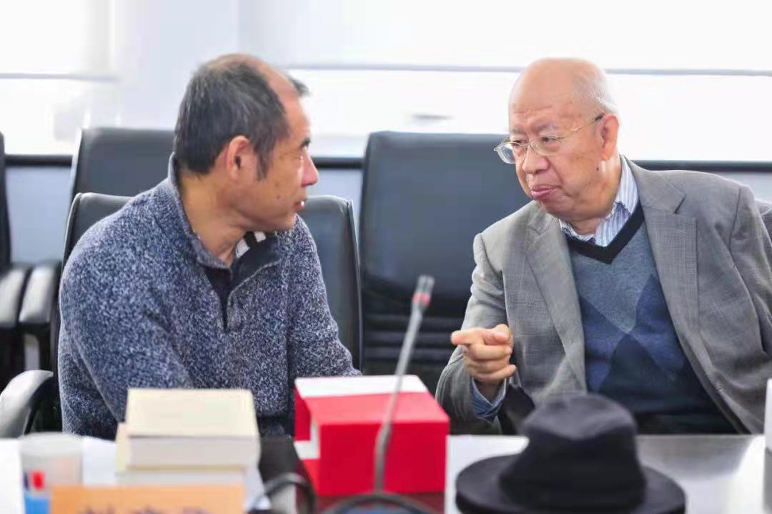叶老师是9月27日6时离世的,这两天,网上流传着大量缅怀叶老师的文章和叶老师的遗文遗像。在漓江出版社推送的《深切缅怀:翻译家、德语文学研究专家、卡夫卡研究专家叶廷芳先生》的文章中,我惊喜地看到了我与叶老师的一张合影。我之前没有见过这张照片,拍摄地点是中国社科院外文所,时间是2018年12月,当时我和叶老师一起参加漓江出版社举办的《春潮漫卷书香永——开放声中书人书事书信选》(刘硕良先生主编)出版座谈会。照片上的叶老师抬起手,在对我说着什么。这可能是我与叶老师的最后一张合影。