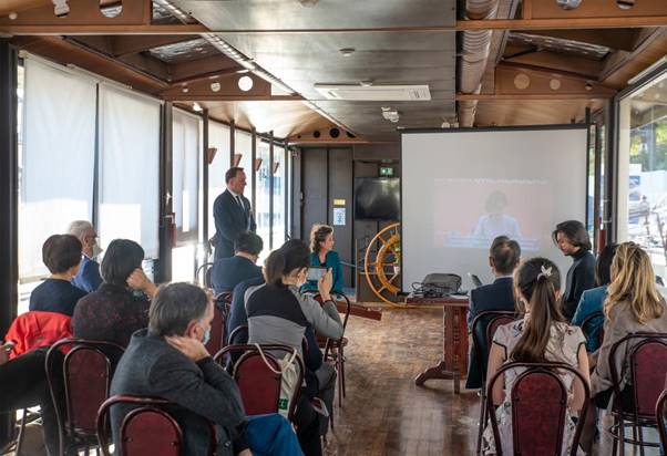 法国当地时间10月24日下午,一场别开生面的法国“中国文学读者俱乐部”活动在巴黎塞纳河的一条游船上举行。法国“中国文学读者俱乐部”负责人高醇芳主持活动,策划人萨维耶·米雄-雷嫩巴克代表读者俱乐部致欢迎词。法国作家、教育部哲学督学项-伊夫·夏杜、莫里哀中学副校长菲利普·埃夫诺、当代书店出版社社长梅丽塔·西尼贝尔贝、法国作家方索·布燮、媒体人杜波、旅法作家亚丁等20多位嘉宾参加,中国驻法大使馆文化公参严振全、前法国驻华外交官文娜等到场祝贺。活动得到法国当地多家媒体报道。