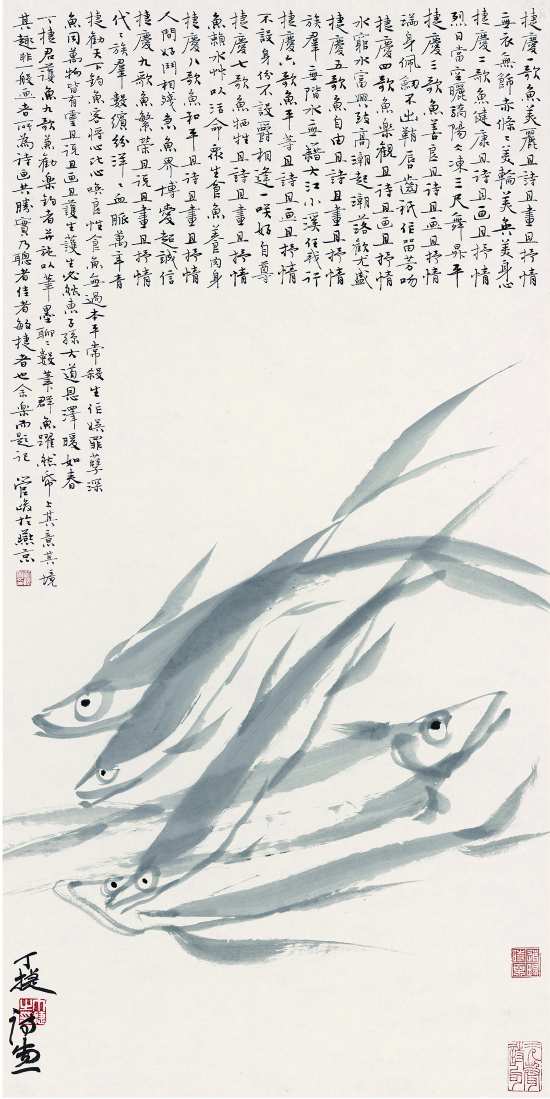丁捷也是一位诗人,为鱼写了不少诗,其中的《护鱼九歌图》等配有《护鱼诗画》,赋予鱼以新的结构形态。在诗中,他以歌颂鱼的美丽、健康、善良、乐观、自由、平等、牺牲、和平、繁荣为前提,劝诫钓者放下屠竿去反思,以体现合乎人本性的生存方式。他认为,“画鱼的目的是护鱼,试图以鱼的形态之美和品行之善,来唤醒人类对施恩于己者的感恩之心。鱼只是我思想感情的载体,我希望人们在艺术中,滋养出一点对无辜生命的敬畏,体恤。”在伦理原则的规约下,通过艺术作品的呈现,让人感悟真理。这既表现出丁捷对现实和当下的关怀,又从生态美学的视角将物从对象中拯救出来,显示出超越文本叙事的伦理禁忌,蕴含着艺术独到的伦理价值和道德力量。