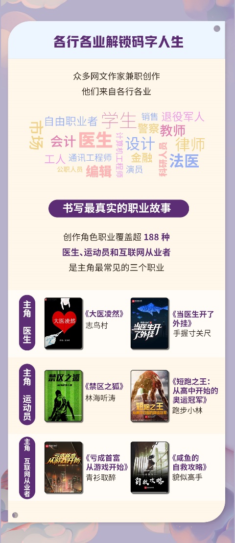 因此,丰满、生动的职业角色在网文故事中接连诞生。三百六十行,行行都有故事。迄今为止,网文作家创作角色覆盖的职业超188种,其中,医生、运动员和互联网从业者是被创作得最多的三个职业,也是职业文主角最常见的职业。志鸟村《大医凌然》、手握寸关尺《当医生开了外挂》,专注于医生的心路历程与职业故事;林海听涛《禁区之狐》、跑步小林《短跑之王:从高中开始的奥运》,书写足球和田径运动员的竞技故事;青衫取醉《亏成首富从游戏开始》、貌似高手《咸鱼的自救攻略》,聚焦于互联网从业者的创业之路。这些取材于不同职业人群现实经历的网文作品,生动记录了众多专业细节和行业背景,让读者在娓娓道来的故事中熟悉各行各业。