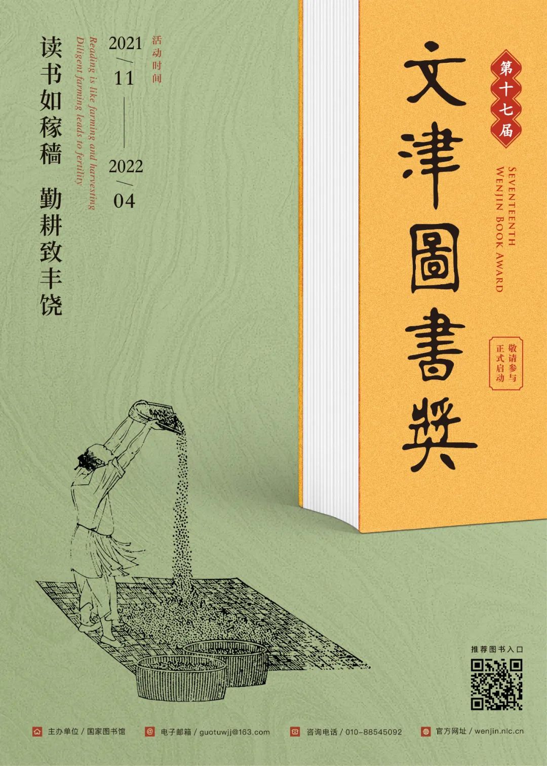 文津图书奖是国家图书馆主办并联合全国图书馆界共同参与的公益性图书奖项,自2004年创办以来,已经成功举办了16届。自即日起,国家图书馆第十七届文津图书奖正式启动。本次评选图书范围为2021年1月1日至12月31日(以版权页记载时间为准),由国家出版行政管理部门批准成立的出版机构在国内正式出版、公开发行(包括限国内发行)的汉文版图书,不包括重印本和已获过文津图书奖的再版图书。参评图书分为社科类、科普类和少儿类3类,侧重于能够传播知识、陶冶情操,提高公众的人文与科学素养的非虚构类(少儿类除外)普及性图书。评委会将通过推荐、初评、终评等程序,选出获奖图书20种、推荐图书60种(均可空缺)。