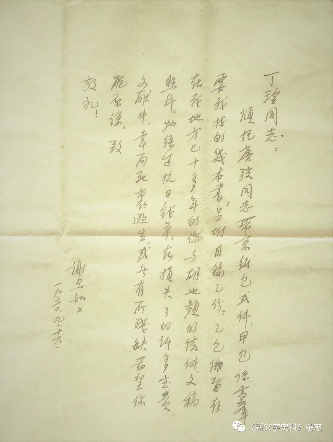 所要文史资料的事,已与文化局谈过(分工管这事的方行副局长),昨天又和鲁迅纪念馆负责人杨兰同志电话谈了。他们答应将有丁玲同志的一部分资料影印一份给她,但因馆内没有影印设备,须送出去印,尚待一些日子才成。印好后将交谢庆中转,特告。