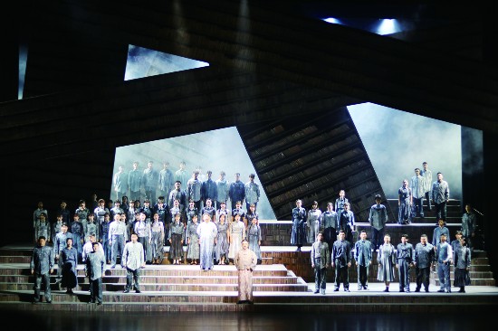 歌剧《王光祈》的舞美设计也非常有特点,其视觉形象的建立,是从寻找主人公的生平和经历中获得的灵感,即以书籍作为主体性的元素在舞台上构成这种颇具张力的书架空间,寓意着书作为主人公的生命所属,进而作为其能量燃烧直至生命尽头的根本。整个背景的调子是趋向晦暗的,以及醒目而倾斜的、给人不稳定感的线条,似可视为时代与时局氛围和特征的隐喻与象征。而书架空间可作灵活多样的变化和组合,以适应剧中地点的转换和人物居所的变化,这一切又都无不与书这个意象紧密相联,表明主人公在不断追求与攀登中,为家国与至亲奉献最真诚炽热的心与血,并以此照亮了人物曾经走过的那个时代和世界。