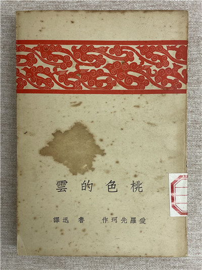 最早在1923年出版的《桃色的云》上,鲁迅就采用古典图案设计封面,该书是由他翻译的爱罗先珂的童话集。封面上半部分采用汉代石刻的人物、禽兽及流云组成的带状装饰,印红色;封面下边用宋体铅字排写书名和作者名,印黑色。橘红色的云纹和边框错落有致,深沉又不失明艳,与黑色形成上下呼应。整个封面设计紧扣童话《桃色的云》的主题,流露出对春之渴望及对自由的希冀。