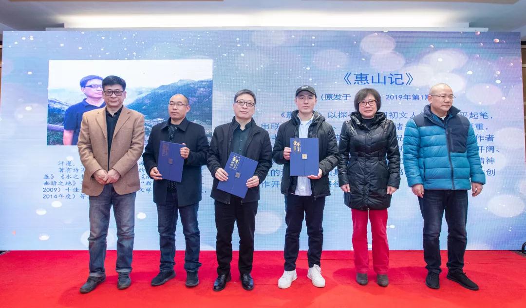 朱辉、胡弦、荣荣为散文奖获奖者南帆(李永兵代领)、王尧(孙衍代领)、汗漫颁奖