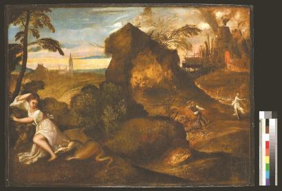 《圣母子》里的人物和风景,是两张皮,被硬叠在一起。没有背后的风景,圣母子的光辉不会减少半分。如果没有人物,也会是一张相当不错的纯风景画。但提香这张《俄耳甫斯与欧律狄刻》不同,人物和风景完全融合在一起,他们共同完成了叙事,谁也离不开谁,不再可有可无。风景在画面中的重要性,显然比以前提高了。