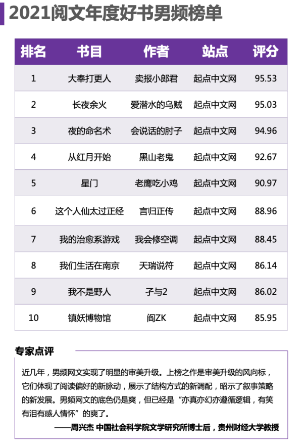“近几年,男频网文实现了明显的审美升级。” 中国社会科学院文学研究所博士后、贵州财经大学教授周兴杰评价,《2021阅文年度好书榜》的男频榜单,客观反映了好书品质,网文的脑洞要大,逻辑要通,才能受人追捧。尽管男频网文底色未变,但实现“爽”的方式以及“爽”的耐受有了明显拔高,已经是“亦真亦幻亦遵循逻辑,有笑有泪有感人情怀”的爽了。