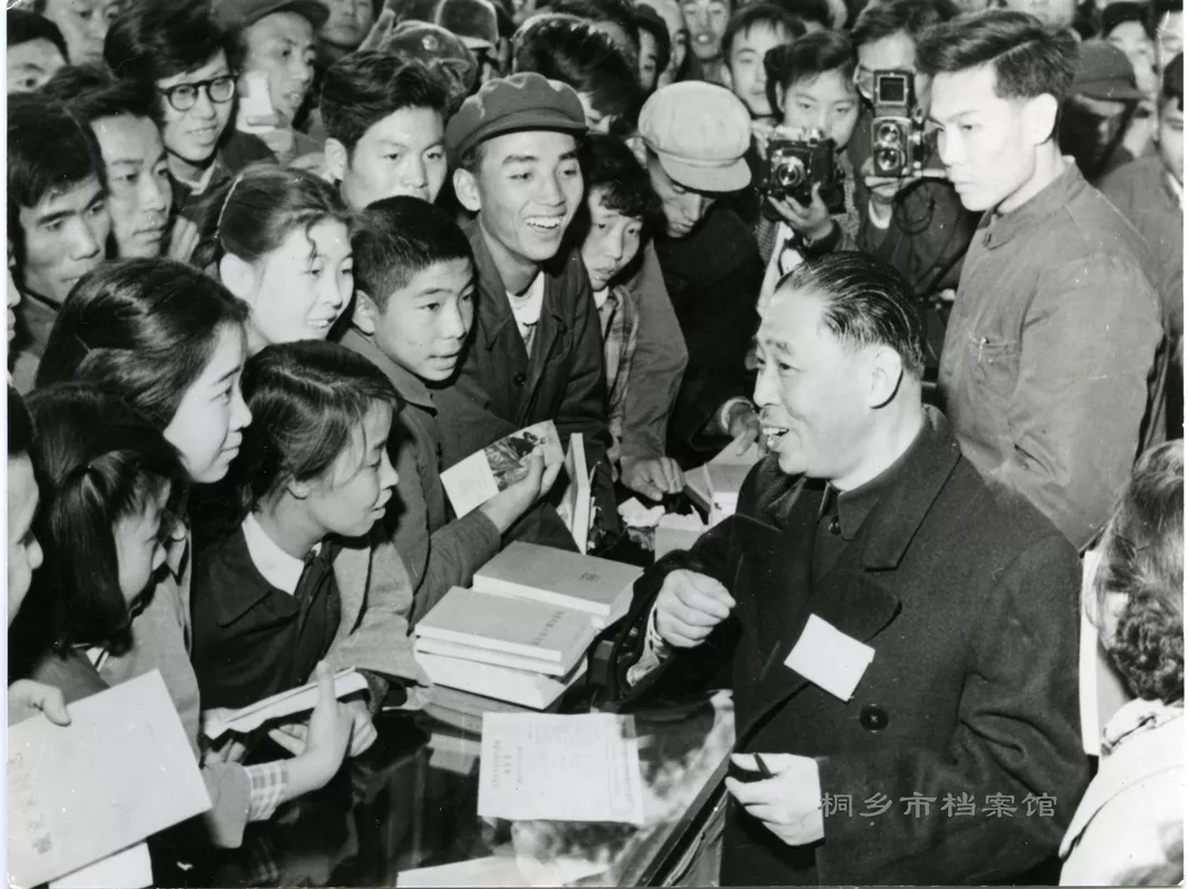 1957年11月7日,新华书店为纪念和庆祝十月革命四十周年,在劳动人民文化宫举办露天书市,茅盾应邀参加并为读者签名留念。(桐乡市档案馆藏)
