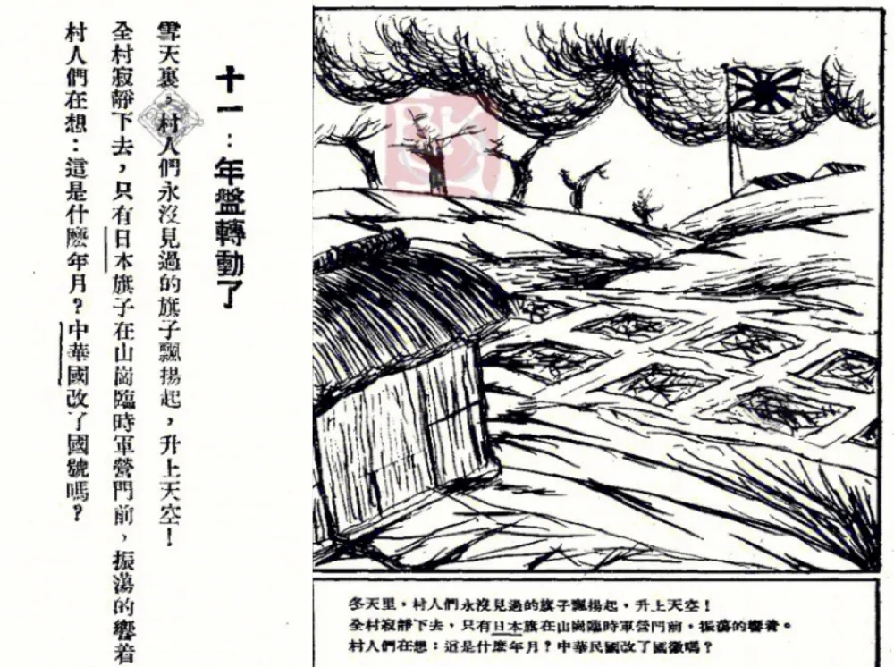 左侧为《生死场》第十一章《年盘转动了》;右侧为1939年上海华盛顿出版公司出版的由张鸿飞绘制的图画版《生死场》的相关内容,图中近景为荒芜的麦田,远景为侵略者的旗子