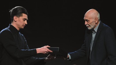 列昂尼德·优素福维奇(右)接过第十六届大书奖的奖牌。摄影:瓦列里·梅利尼科夫