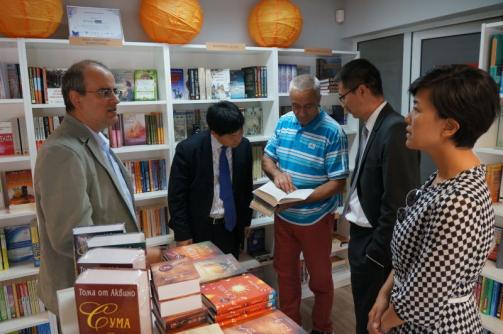 2016年6月10日,外研社代表团访问保加利亚东西方出版社并洽谈开设中国主题编辑部。左一韩裴,左二外研社副总编彭冬林,左三保加利亚东西方出版社社长柳本·科扎雷夫,右二外研社时任社长蔡剑锋,右一林温霜。图片来源:林温霜