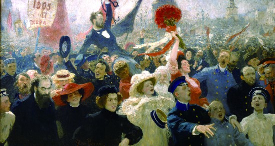 另一幅题为《1905年10月17日》的画,表现一场俄国1905年民众抗暴的革命场景,作者明言:“这里表现的是俄国社会解放”。画上的师生和工人摇动红旗歌唱,托举一个“被赦免者”,欢呼他终获自由。画家这种渴望自由的情怀,于1903年在荷兰湾海岸画的《何等自由!》里已经流露。那是一对男女青年在浪花中跳玛祖卡舞,恰似一首青春的赞歌,在1905年革命潮流中愈显热情洋溢。这一现象表明,列宾虽然也为沙皇尼古拉二世和瓦尔瓦拉男爵夫人等显贵画过像,但他内心始终是同情俄罗斯广大穷苦大众,支持革命者反抗暴君的。