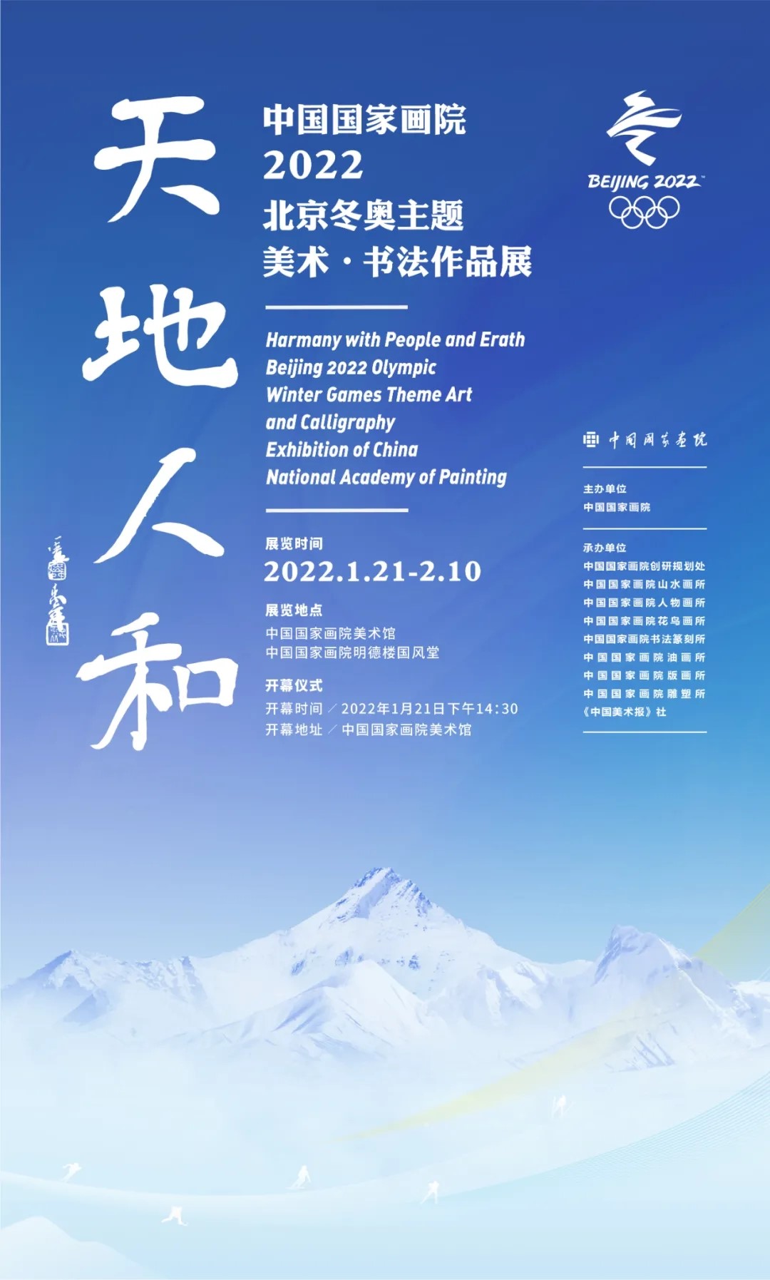 1月21日,由中国国家画院主办,中国国家画院创研规划处、山水画所、人物画所、花鸟画所、书法篆刻所、油画所、版画所、雕塑所、中国国家画院美术馆、《中国美术报》社承办的“天地人和——中国国家画院2022北京冬奥主题美术·书法作品展”在中国国家画院美术馆开幕。“天地人和”是中国传统文化中天人合一思想的精髓,展览以此为主题,正契合了冬奥“绿色生态可持续”的人文理念。