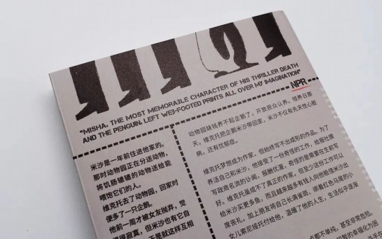 为了生存,维克托接下了给报社写讣闻的工作,为还活着的名人提前写好悼念文章,这似乎是常规操作。企鹅米沙因毛皮颜色的先天条件,经常被租借作为丧礼礼仪队成员。维克多赚了钱,从喝伏特加到喝白兰地,米沙也可以在冰水的浴缸中泡澡。于是,双薪家庭愉快地生活着。有多愉快呢?维克多和朋友带着米沙坐在结冰的河面上钓鱼喝酒,旁边有一个喝了很多伏特加的人问,我不确定是不是眼花了,刚才这里是不是有一只企鹅?