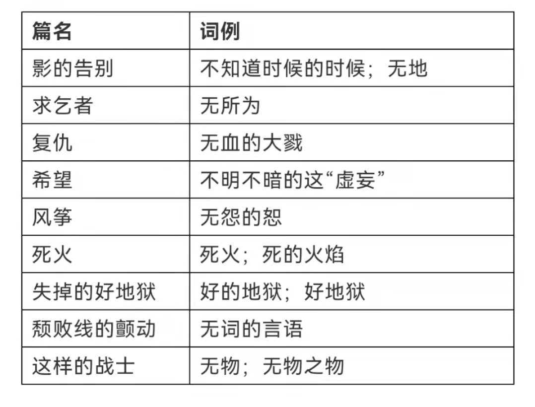这些词例的特点在于,它们并无现实的对应物,造词方式是通过在逻辑上延伸词的含义而生成与事实不符、却于理可通的新词。这就意味着,这些词不是表达一般意义上的真实,而是表达心理意义上的真实,也就相当于创造一种真实。创造真实当然也是语词的功能之一,自有其意义。鲁迅所造生词的特点在于,这些词基本上是以相同的逻辑方式,即“不存在的存在”,造出来的。这些词是鲁迅用以拓进“内部之生活”的关键性词语,说明鲁迅想象“内部之生活”的方式比较单一,难以像他在其他文类中描摹非“内部之生活”那样,调动丰富多样的、有层次感的表达方式。那么,与其强调和肯定鲁迅在《野草》写作中取得的语言和诗学强度,不如做一些让步,承认鲁迅的表达是有限度的,常常是不得不停止在既有语词系统的内部,无法自拔。事实上,正如鲁迅总是以模进的手法描摹现代心灵的问题一样,在《野草》的每一个具体文本中,他也总是以不断重复某一个或几个句式的方式在进行写作,其表达的强度不是来自不断的变化,而是来自不断的重复。不断的重复当然带来强度,但更带来限度。充分重视《野草》表达“内部之生活”的限度是非常必要的。以《影的告别》为例,鲁迅复沓的就是下列四个句式: