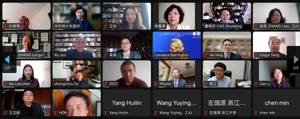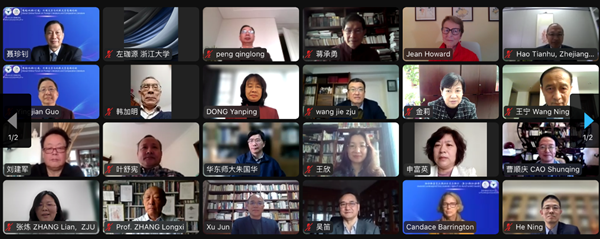 3月18日至20日,由浙江大学外语学院主办,中世纪与文艺复兴研究中心承办,《浙江大学学报(人文社会科学版)》协办的“跨越·比较·汇通:外国文学与比较文学高端论坛”在线上顺利召开。哥伦比亚大学教授Jean E. Howard、香港城市大学教授张隆溪、中国人民大学教授杨慧林、上海交通大学教授王宁、四川大学教授曹顺庆、中国社会科学院研究员陈众议、北京外国语大学教授金莉、上海外国语大学教授查明建、中康涅狄格州立大学教授Candace Barrington等近四十位国内外专家学者应邀参与了论坛。浙江大学副校长何莲珍为论坛开幕式致辞。浙江大学文科资深教授许钧担任论坛的学术委员会主席。会议于18日下午、19日上午和下午共举行了三场论坛,二十四位与会学者做了主题发言。会议同期在B站进行了直播,四千多人次在线聆听,惠及校园内外。论坛线上合影