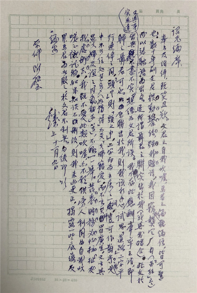 奉书及附件,既笑且叹。文君之自我吹嘘,马君之偏听偏信,皆可惊也。数十年前文君殷勤攀结,强我赠诗,我因窃取龚定厂句(“亦狂”云云)而以张融语为出句。是所谓聂君之联实出于我(或与我暗合)。此文于出典既不尽不实,又与事实乖违,想系为文君所误。我不存此应酬牵率之诗,即归之聂君可也。如原联出于我,则我该打手心也;试思“道路”二字平行连绵之词,“头巾”则“头之巾”,二字而为主属之一词,岂可作对乎?马文中不可信处甚多(如谓“得”太炎“夫妇宠爱”,而不言其师冒广生,又言与愚夫妇交谊之“同气相求”等),不暇一一举。发表时务必将拉扯及我处删去,我既不爱此类吹嘘,亦不愿供旁人利用为自我吹嘘之衬托物。如果知误不删改,则我来函更正,揭露一些底蕴,反累马君为者败之,于文君不利矣。匆复,即颂