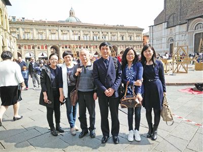 2016年,吴双英(右一)和曹文轩、梅子涵、汤素兰等作家参加博洛尼亚书展途中。