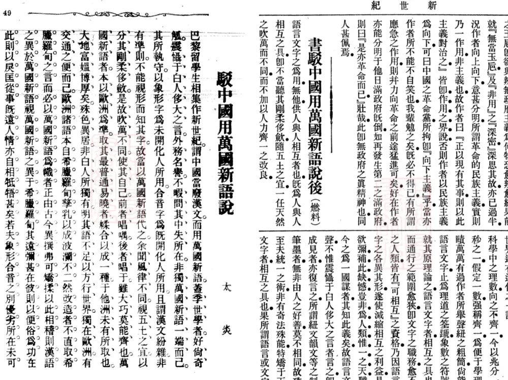 1908年,章太炎和吴稚晖等人就“万国新语”问题展开论战,图为章太炎《驳中国用万国新语说》和吴稚晖《书驳中国用万国新语说后》,分别发表于该年《民报》21期和《新世纪》第57期